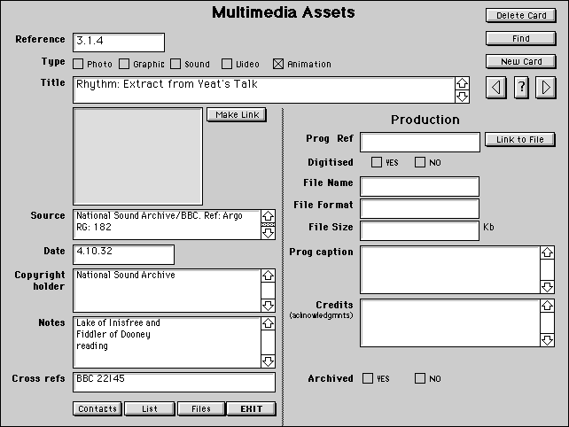 This article has concentrated on highlighting these problems and suggesting how best to avoid them. The multimedia database management system described has been designed to serve the needs of a particular project, the life and works of Yeats; its approaches and lessons, however, apply to the production of any multimedia title involving large numbers of assets.